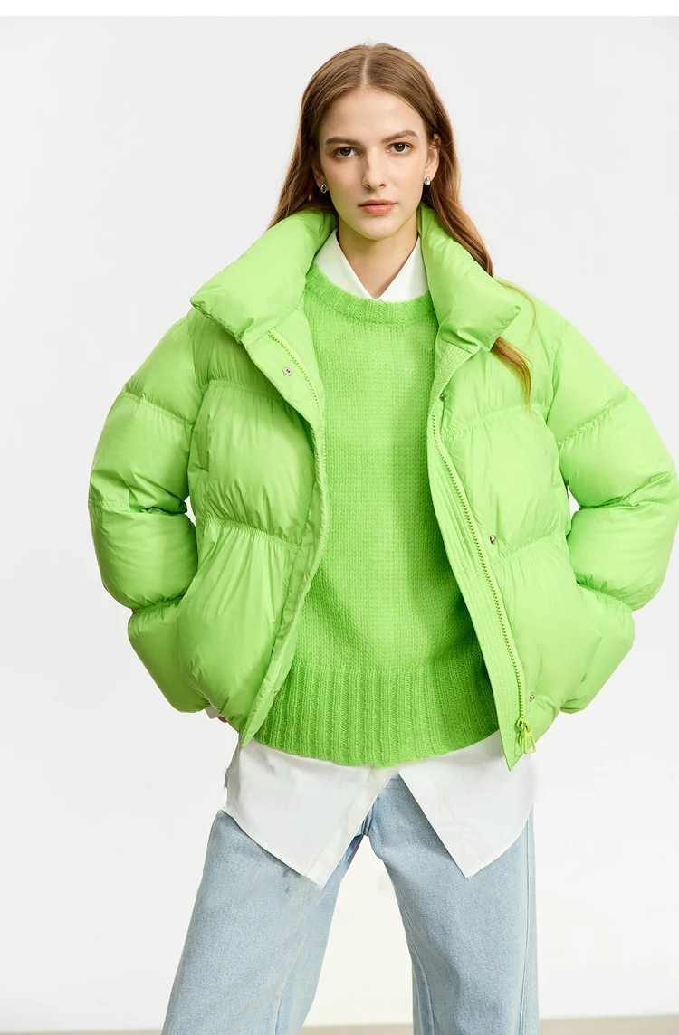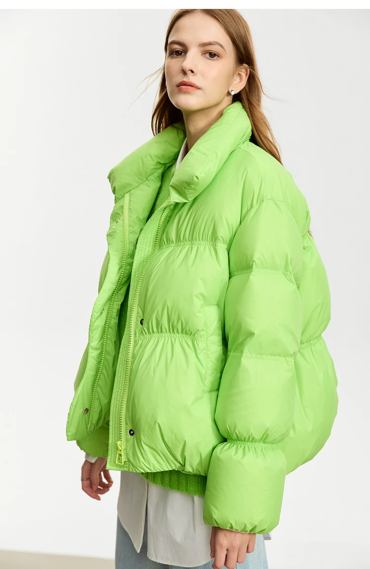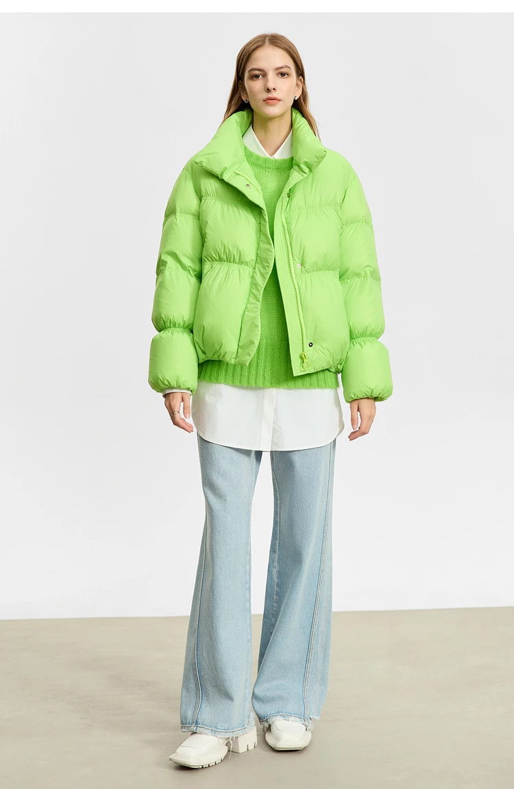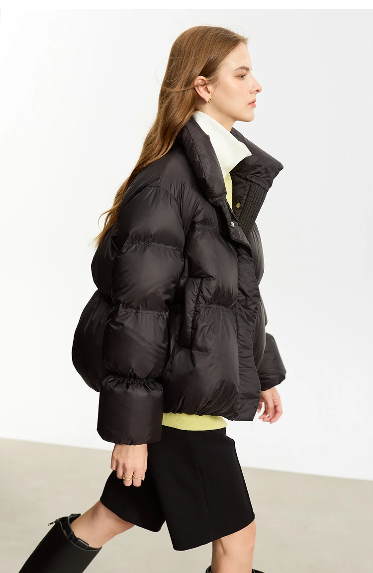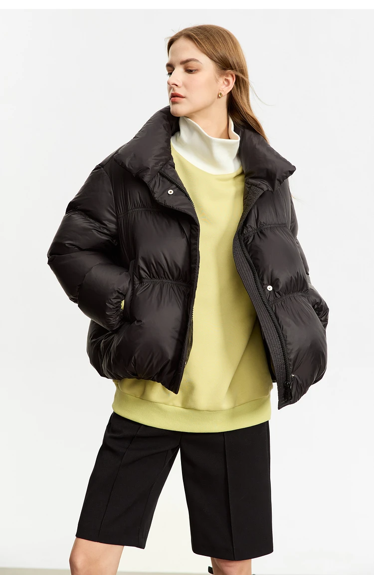 A minimalist down jacket designed for serious winter warmth with a clean, polished finish. Filled with high down content for lightweight insulation, it features a full-zip front with button detailing and a structured collar for a refined, everyday look. The regular length and wide-waisted cut make it easy to layer while keeping a sleek profile.