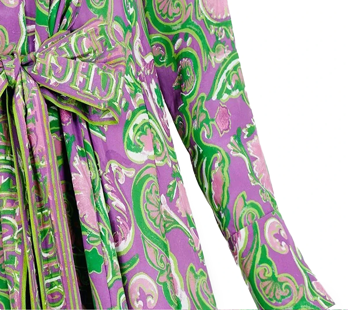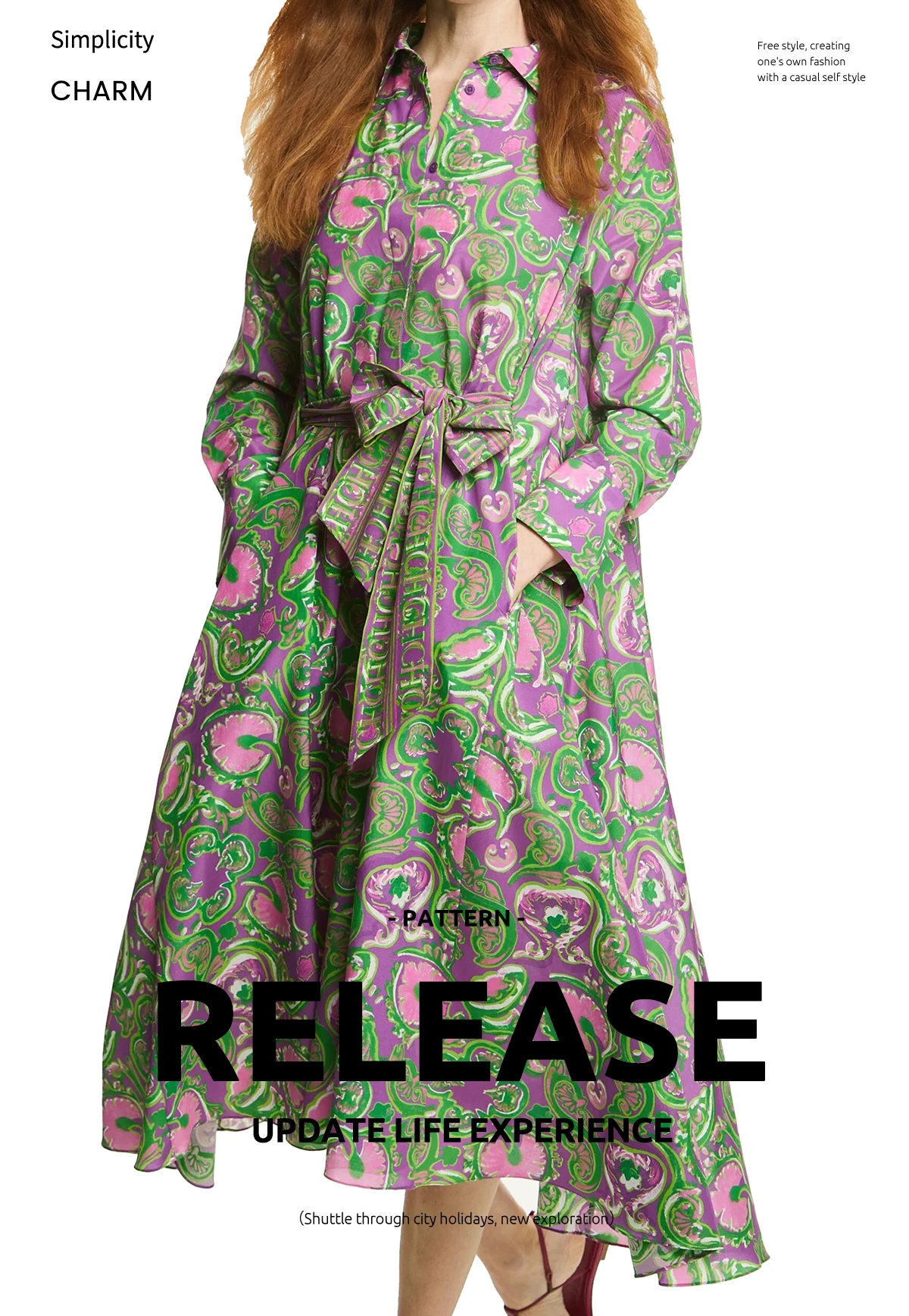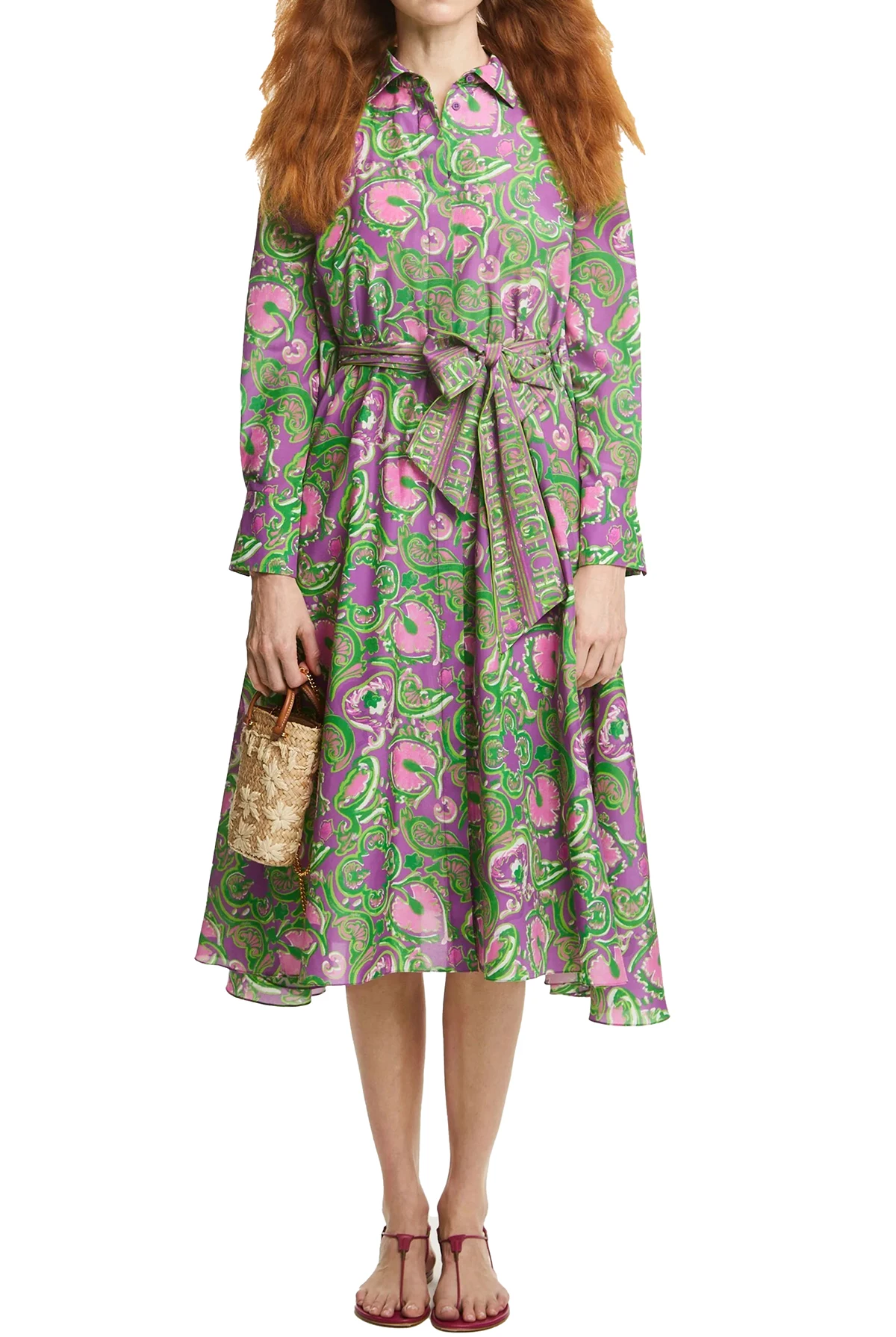 Designed with long sleeves, a classic collar, and waist sash detail for a refined feminine touch.