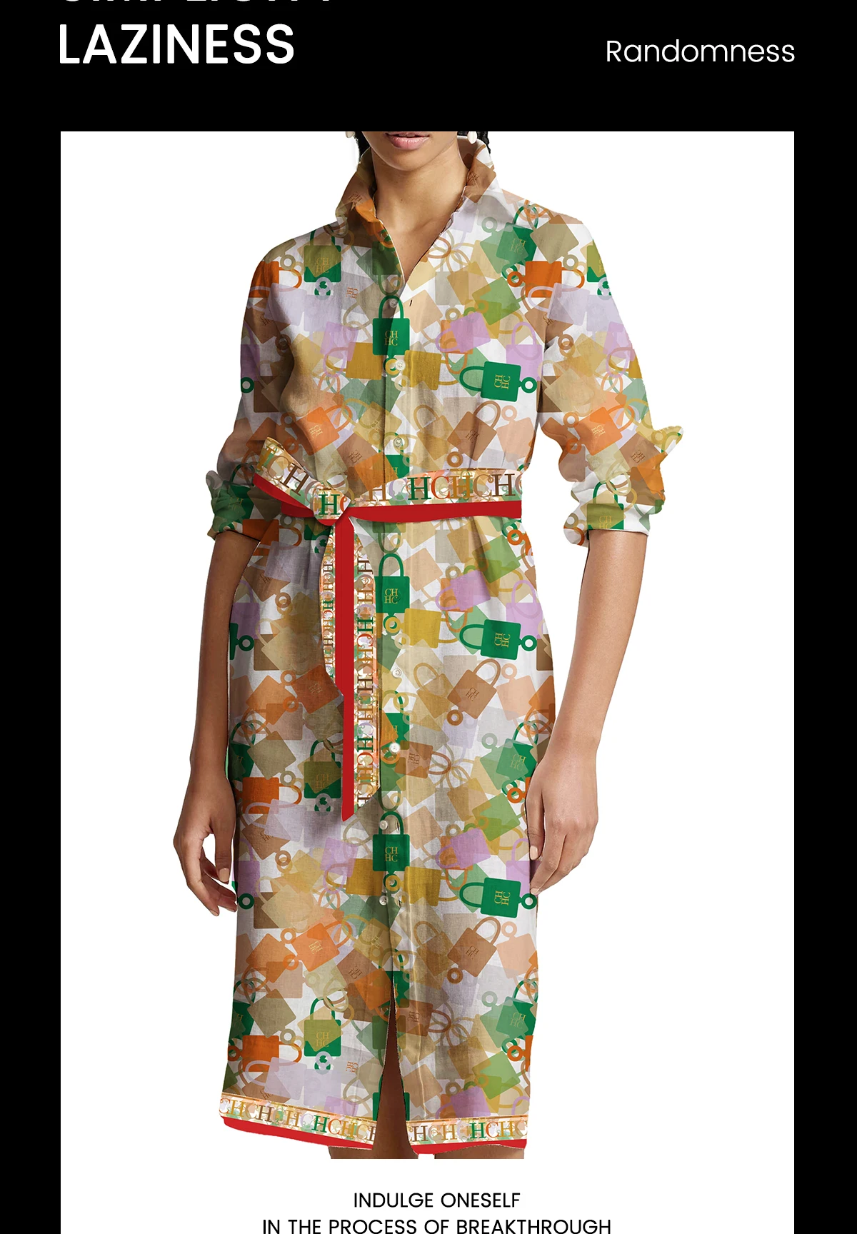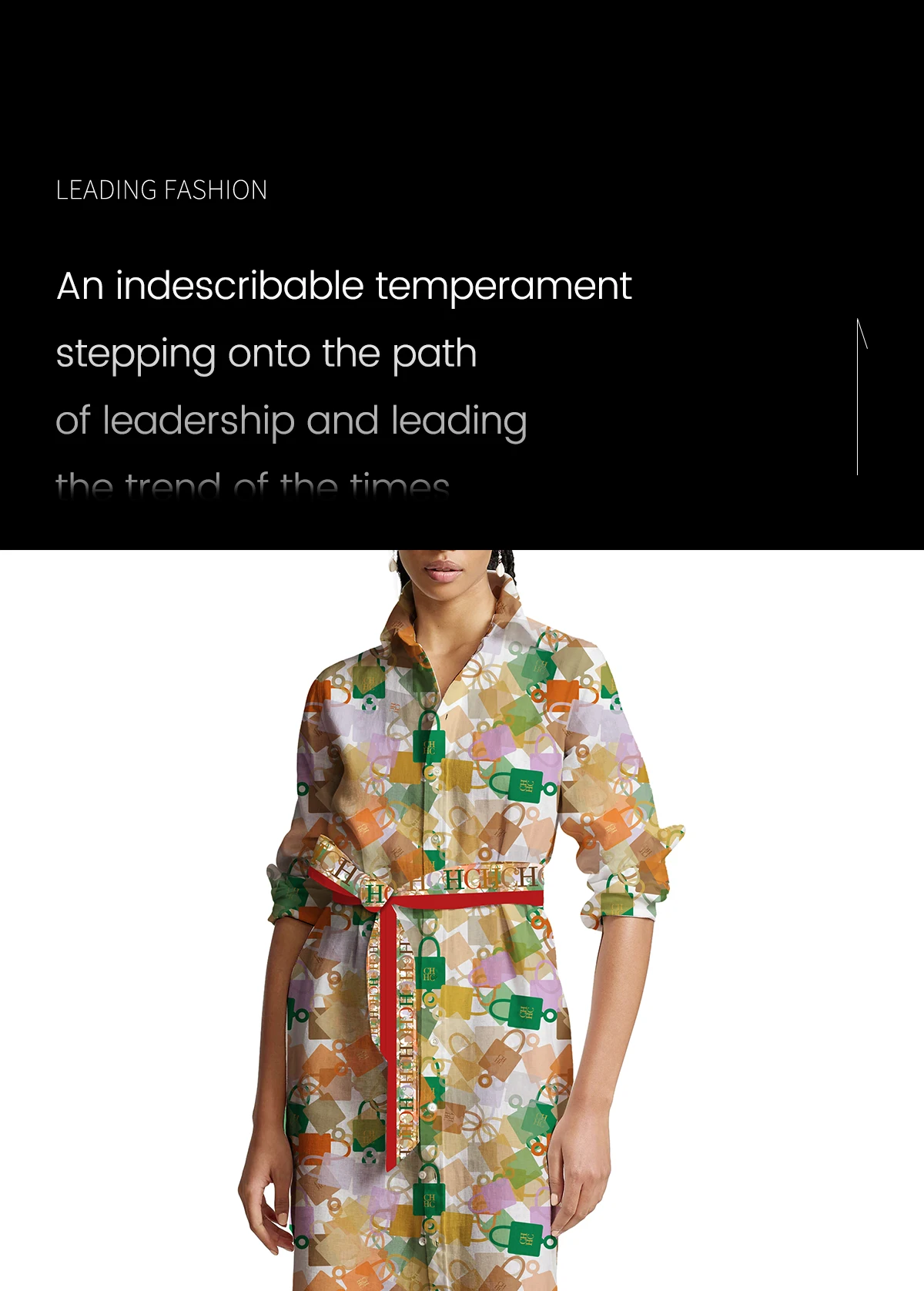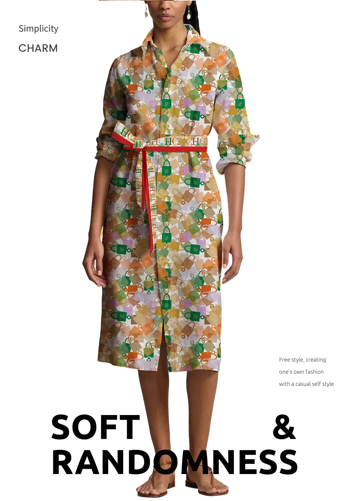 The classic shirt collar, long sleeves, and waist sash add a sophisticated touch while maintaining a relaxed feminine look.
