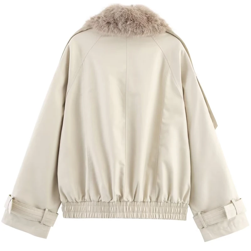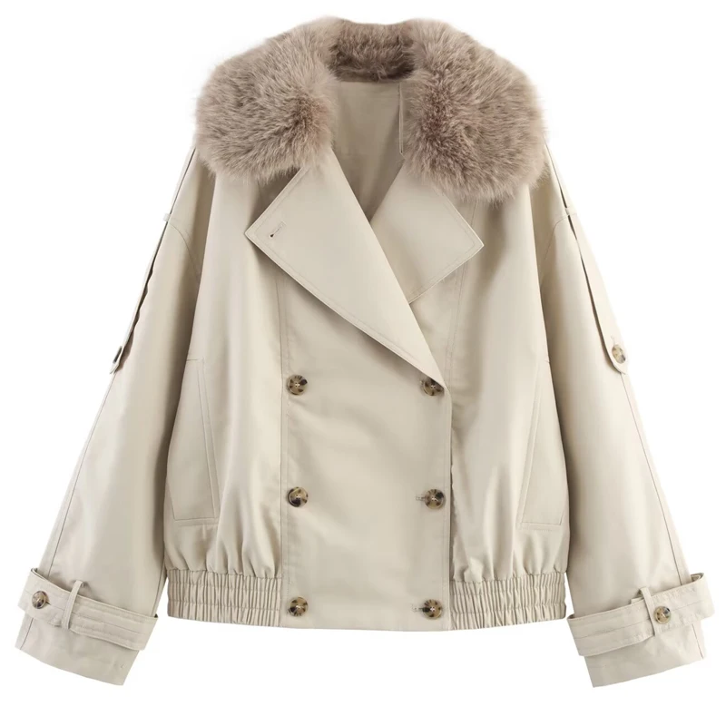 A cropped trench-style jacket designed to elevate daily outfits with a polished, structured look. Featuring a double-breasted front and a classic turn-down collar, it delivers a clean, timeless silhouette with an easy, oversized feel—ideal for autumn/winter layering.